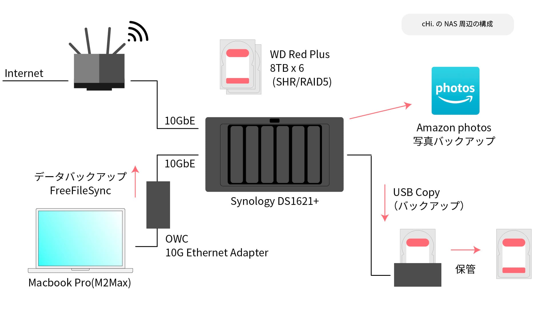 Synologyの機能を使い、USB接続で過去に使用していたHDD等を回、年ごとにバックアップを行ったり、写真はAmazon photosへバックアップを行ったりと、バックアップも簡易的ですが行っています。
