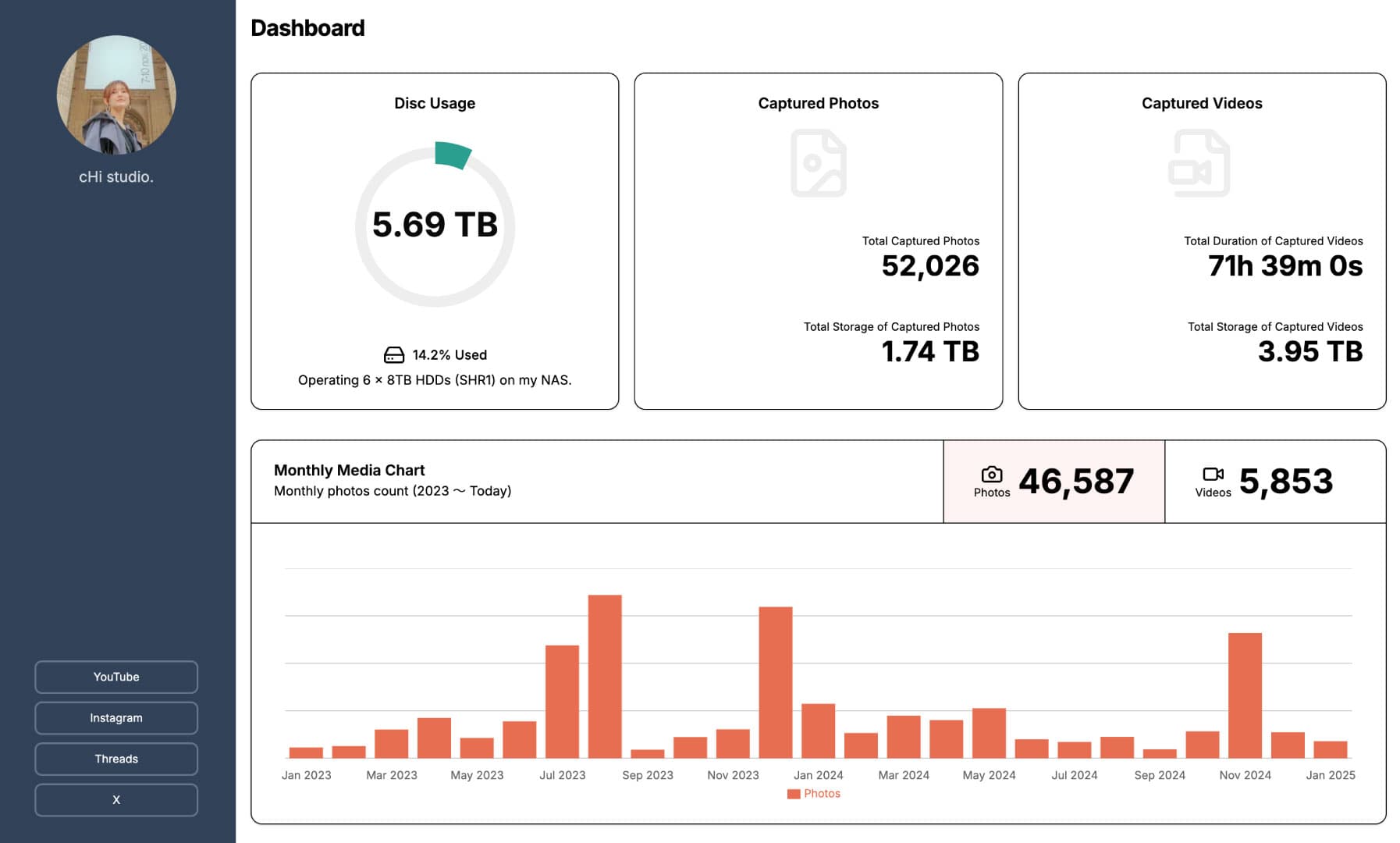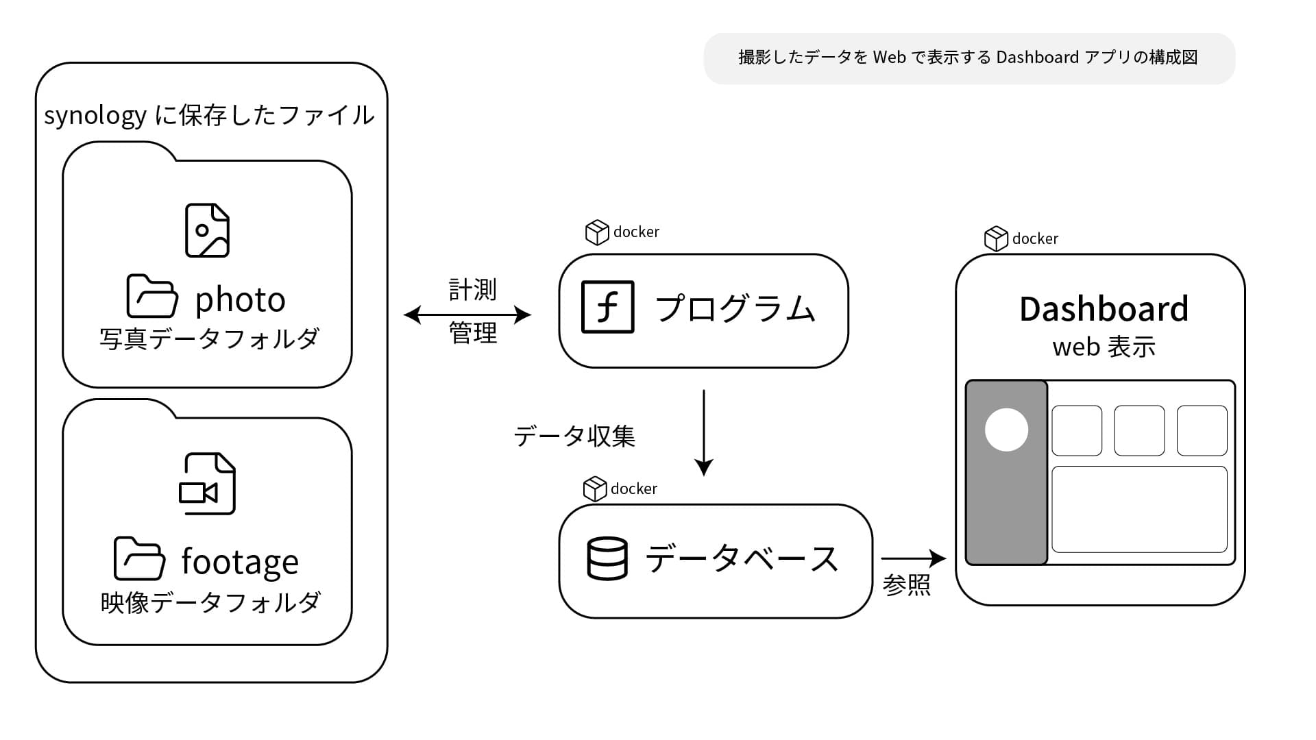 撮影したデータの容量やYouTubeの登録者数、SNSのフォロワーなど増えていくと、頑張ったんだなと見て感じられるなと思い、そんな数字が見られる物が作りたいなと思っていました。私の場合はNASには日々、写真のデータや撮影た映像データが保存されていきます。この増えていくデータに着目をして写真、映像データを見られるダッシュボードを作りました。