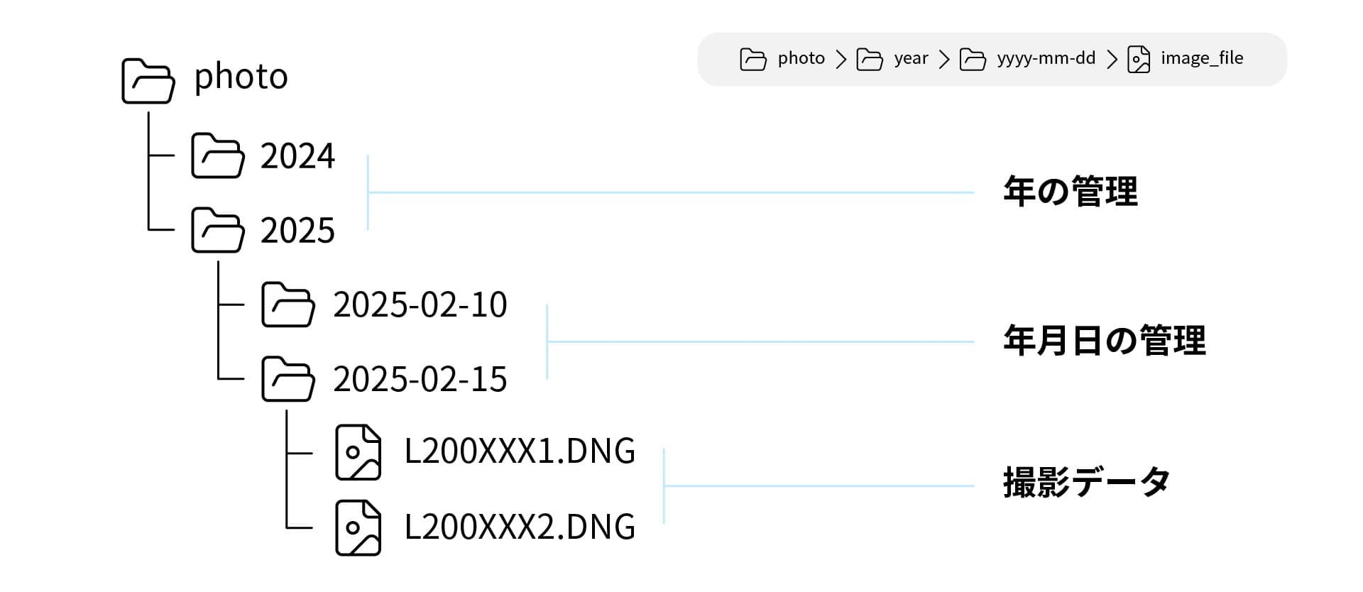 画像はLightroomやCaptureOneなどのカタログ機能で管理をしているので、/年/年-月-日/ というような形で保存を行っています。