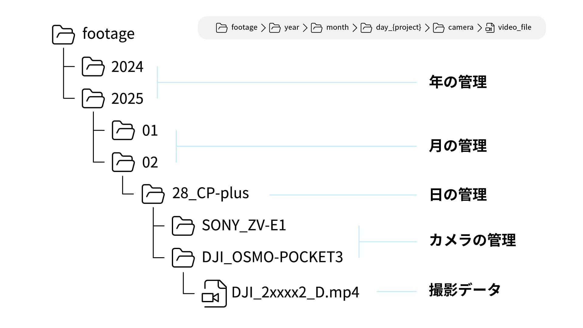 映像データは、YouTubeの撮影向けに撮影することが多いので、プロジェクト名を入れて、/年/月/日_{プロジェクト名}/カメラ名 というような形でデータを振り分けています。写真のように年-月-日というフォルダを作らないかというと、プロジェクトごとにデータをバックアップしたり、写真と違い映像データは大きくなってしまうので、わかりやすくバックアップしやすくなるように年/月/日で区切っています。